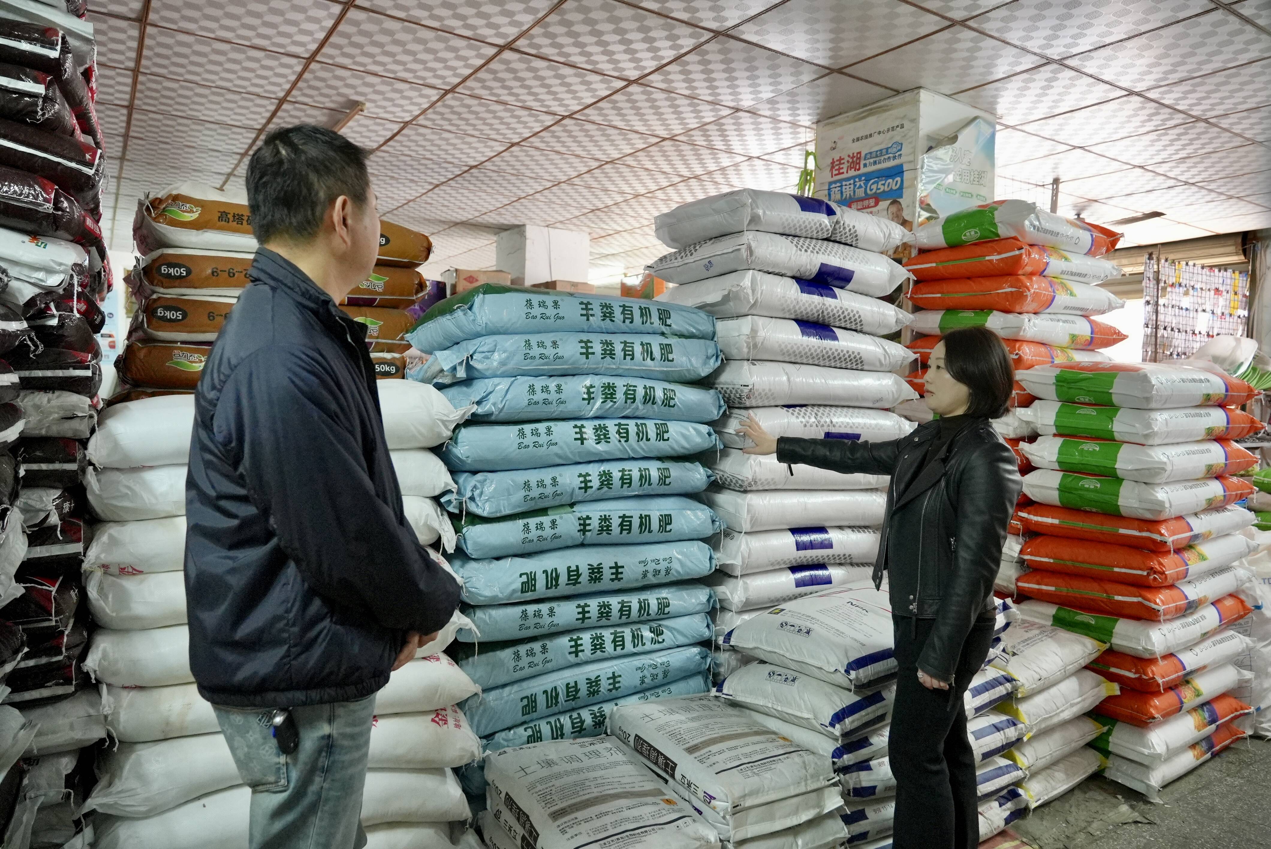 在农资公司门店内,记者看到,各类种子、化肥、农药等农资产品依照品类规整地摆满了货架,不时有市民和农户进店选购。