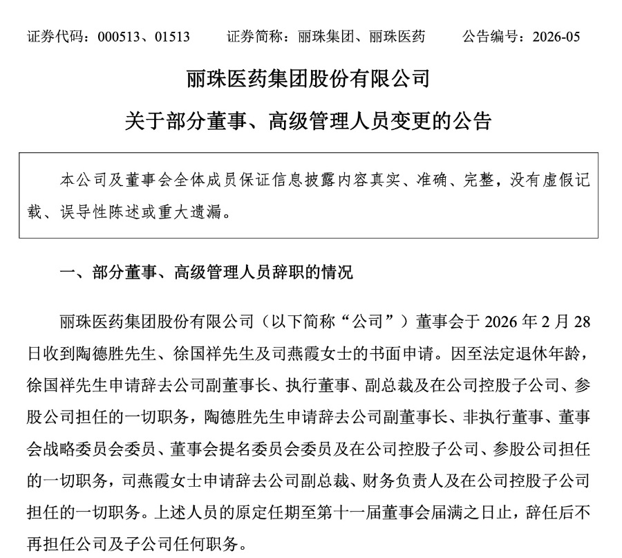 根据丽珠集团公告,陶德胜、徐国祥、司燕霞三位高管因到达法定退休年龄卸职,均辞去在公司及子公司、参股公司的相关职务,其间徐国祥辞去副董事长等职,陶德胜辞去非履行董事及董事会相关委员会职务,司燕霞辞去副总裁、财政负责人等职。