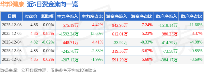 证券之星音讯,到2025年12月8日收盘,华邦健康(002004)报收于4.86元,上涨0.0%,换手率1.42%,成交量26.72万手,成交额1.3亿元。